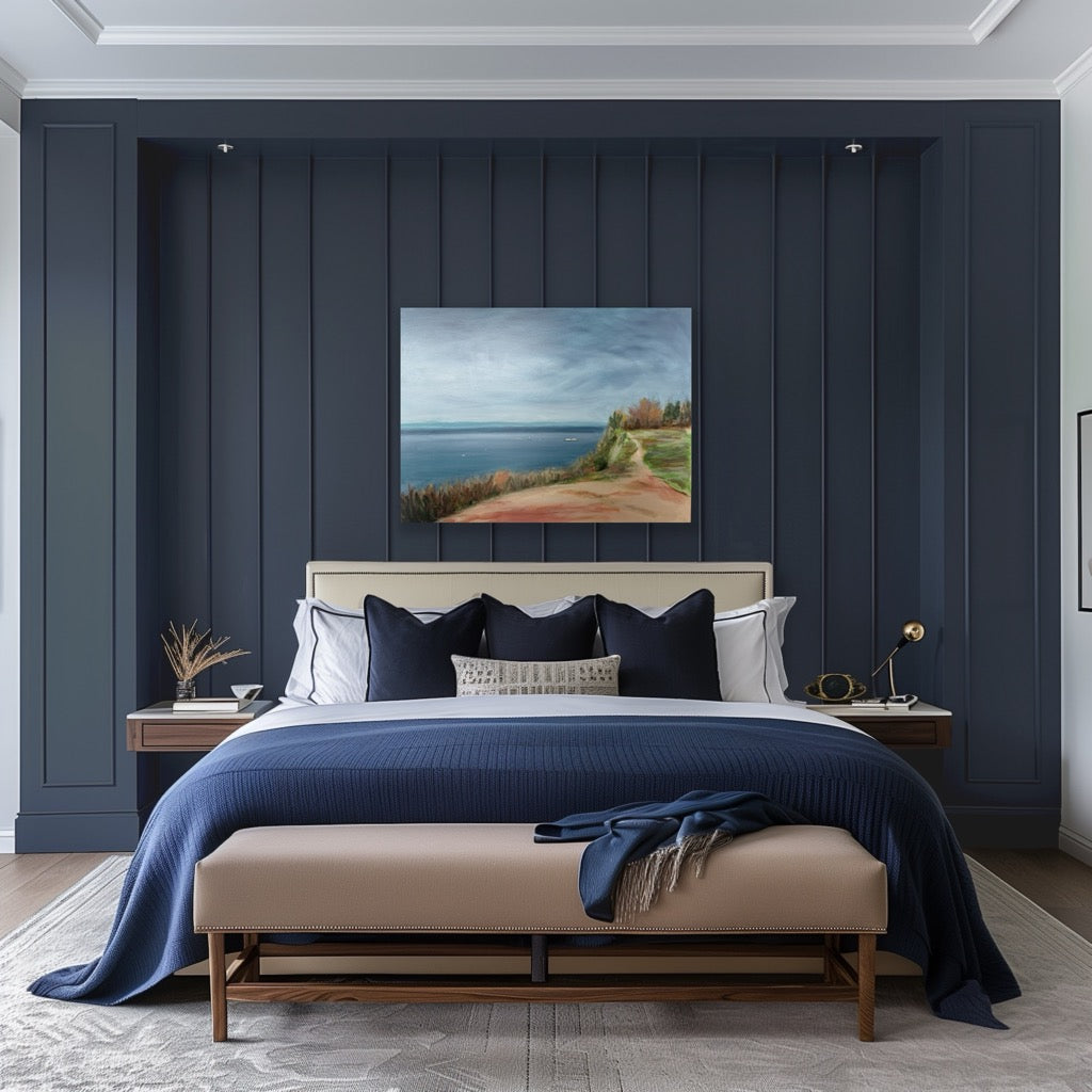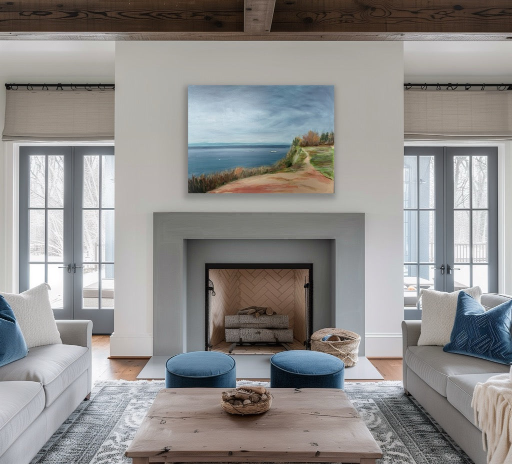 36x48” acrylic landscape painting on 1.5” deep canvas. Wired and ready to hang. Edges are painted black. Inspired by many walks on the sandy bluffs in Discovery Park in Seattle, Washington, Magnolia neighborhood. Overlooking the Puget Sound, ferries, and boats.